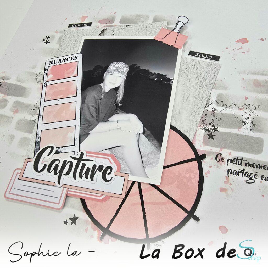 Cette page de scrap réalisée avec la box de novembre 2025 met en avant une composition douce et équilibrée autour d’une photo en noir et blanc.