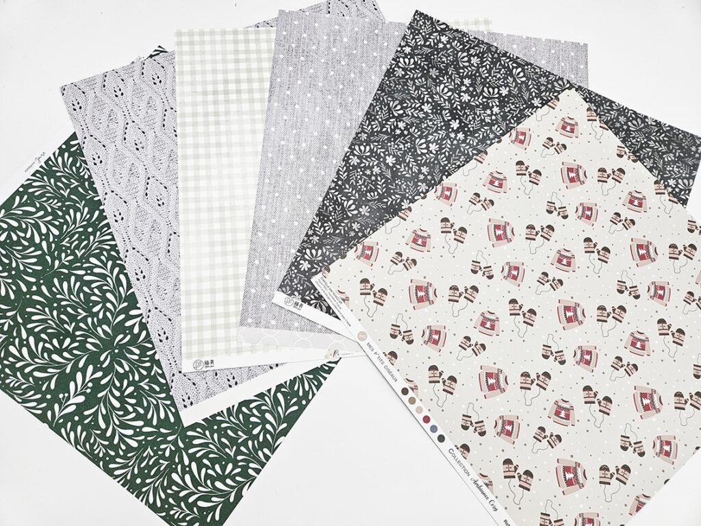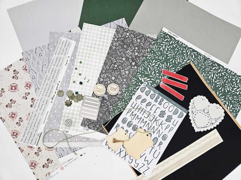 Les papiers dans des tons verts profonds, gris doux et vert de gris créent une atmosphère apaisante, parfaite pour documenter les derniers instants de l’hiver. Les motifs feuillages, trames fines et petites illustrations hivernales apportent une touche de modernité tout en conservant un esprit chaleureux et naturel.