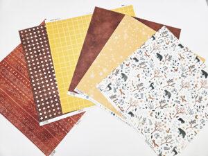 Les papiers aux tons bruns, cuivrés et bleu nuit rappellent la chaleur d’un chocolat chaud au coin du feu, tandis que les motifs forêt (ours, cerfs, renards) nous plongent dans un univers doux et réconfortant.